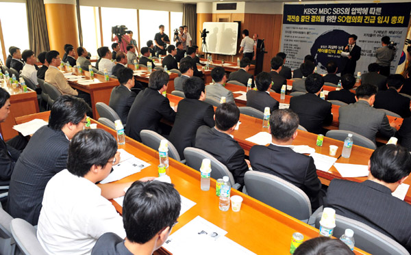 ▲ 지난해 9월 KBS, MBC, SBS 등과 지상파 재전송 문제로 갈등을 빚었던 한국케이블TV협회의 임시총회 모습. 올해 하반기 종합편성채널 개국이 예상됨에 따라 SO사업자들과 종편간의 관계에 이목이 쏠리고 있다. (뉴시스) |