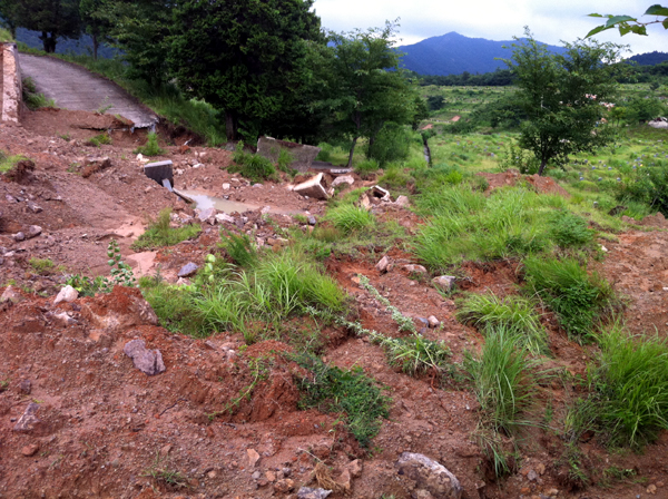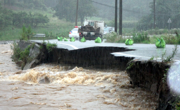 | ▲ 11일 전북 완주군은 8~10일 평균 300㎜가 넘는 폭우로 30억원 이상 피해가 발생했다고 밝혔다. 사진은 10일 오후 집중호우가 내린 완주 구이면 하척마을 인근 하천으로 주변 도로 50m가 유실됐다. (뉴시스=완주군 제공) | ||