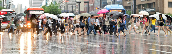 | ▲ 중부지방에 위치한 장마전선의 영향으로 서울, 인천 등에 호우주의보가 발효된 11일 오전 서울 강남역 부근에서 시민들이 우산을 쓰고 횡단보도를 건너며 발걸음을 재촉하고 있다.(뉴시스) | ||