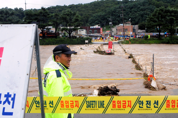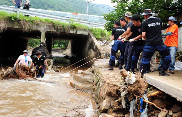 | ▲ 11일 집중호우로 피해가 발생한 청도군 청도읍 원리마을 원리천이 유실돼 경북안전기동대원들이 응급복구에 구슬땀을 흘리고 있다.(뉴시스=경북도 제공) | ||