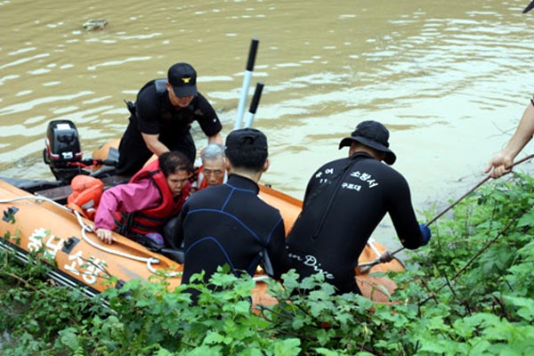 | ▲ 지난 10일 충남 부여군에 집중적으로 내린 장맛비가 내린 가운데 진입로가 침수된 부여읍 중정리 주민들이 11일 부여소방서 119구조대의 도움으로 긴급 대피하고 있다. (뉴시스=부여소방서 제공) | ||