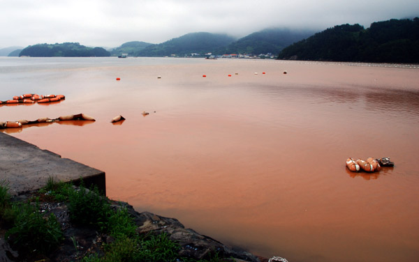 | ▲ 8일 계속된 폭우로 공사현장에서 쓸려 나온 흙탕물이 경남 통영시 죽림만과 북신만 앞바다를 덮쳐 당국이 진상조사를 벌이고 있다.(뉴시스) | ||