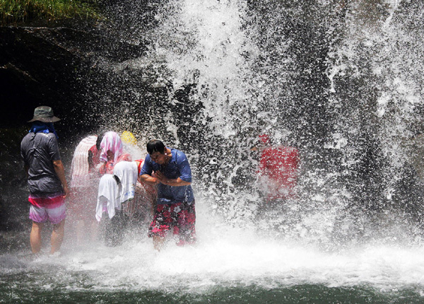 | ▲ 전남 5개 시·군에 폭염주의보가 발령된 17일 전남 구례군 산동면 수기리 수락폭포를 찾은 피서객들이 15m 높이에서 떨어지는 폭포수를 맞으며 더위를 이기고 있다. 수락폭포의 거센 폭포수는 옛부터 신경통과 근육통에 효염이 있는것으로 알려져 있다. (뉴시스=구례군청 김인호씨 제공) | ||