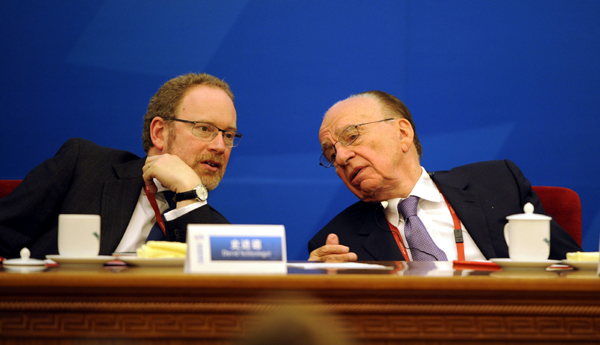 ▲ 루퍼트 머독 뉴스코퍼레이션 회장(오른쪽)이 2009년 10월 중국 베이징에서 열린 세계미디어정상회의(WMS) 개막식에서 데이비드 슐레진저 로이터통신 편집국장과 대화를 나누고 있다. (베이징=신화/뉴시스) |