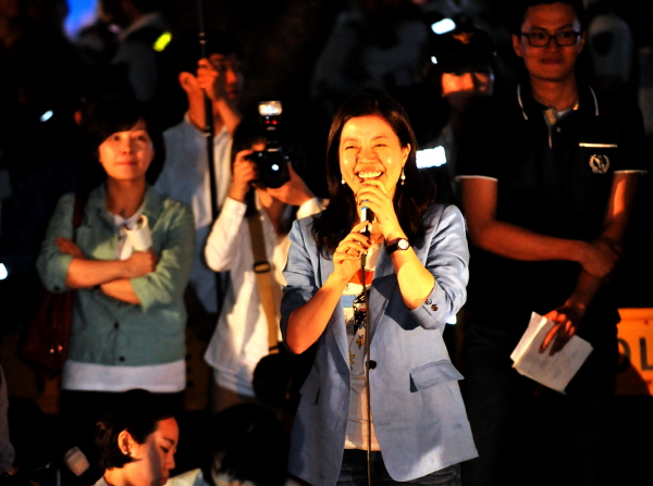 | ▲ 지난 2일 저녁 서울 세종로에서 한국대학생연합(한대련)이 정부에 반값등록금을 요구하는 촛불집회에서 영화배우 김여진씨가 참석해 발언하고 있다.(뉴시스) | ||