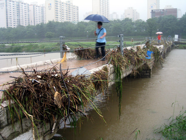 | ▲ 28일 오전 경기 성남시 분당구 이매동 탄천 보도교가 강물이 넘쳐나면서 난간의 기둥과 쇠사슬이 넘어지고 나뭇가지로 덮여 있다.(뉴시스) | ||