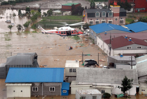 | ▲ 경기도소방재난본부가 27일 오후 경기도 광주시 모현면 초부리 공장 건물에 집중호우로 인한 수해로 고립된 주민들을 헬기로 구조하고 있다. (뉴시스=경기도소방재난본부 제공) | ||