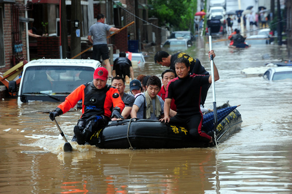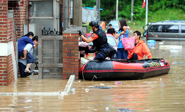| ▲ 27일 집중호우로 경안천과 곤지암천이 범람하며 경기 광주 송정동 주택가가 침수돼 소방대원들이 대피한 주민들을 구조하고 있다.(뉴시스) | ||