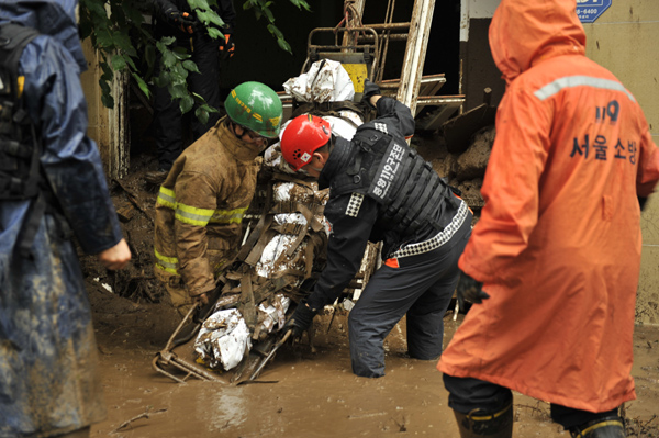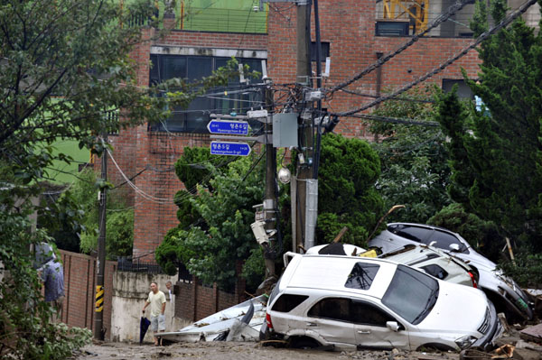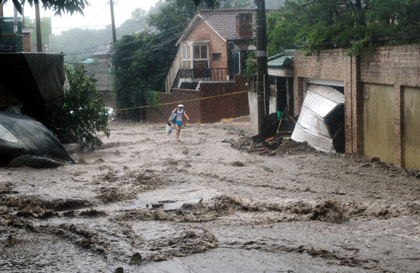 | ▲ 27일 오전 8시 50분께 서울 서초구 우면동 우면산에서 산사태가 발생, 토사가 흘러내리며 형촌마을의 60여 가구를 덮쳤다. 오후가 되어 주민이 침수된 집을 정비하기 위해 이동하고 있다. (뉴시스) | ||