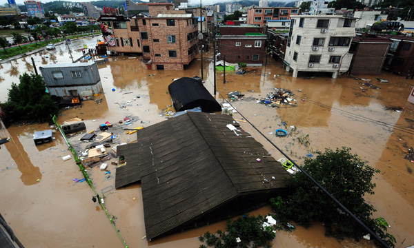 | ▲ 27일 집중호우로 경안천과 곤지암천이 범람하며 경기 광주 송정동 주택가가 침수돼 있다.(뉴시스) | ||