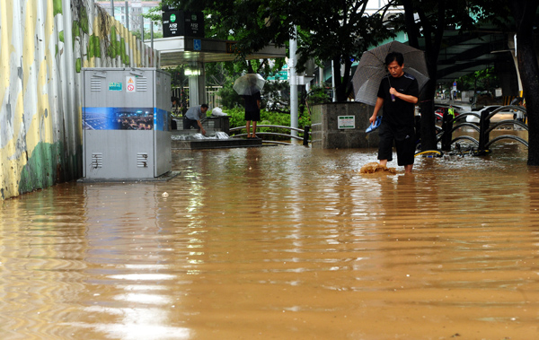 | ▲ 27일 오전 서울 동작구 사당1동 사당역 근처가 폭우로 인해 침수된 가운데 시민들이 물웅덩이를 건너가고 있다.(뉴시스) | ||