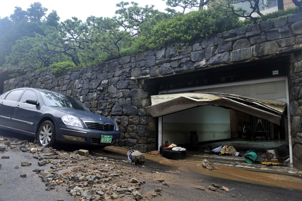 | ▲ 구학서 회장 부인 양명숙씨가 참변을 당한것으로 알려진 27일 오후 서울 서초구 우면동 향촌마을 구 회장 자택 지하 차고문이 수압을 이기지 못하고 터져나온 물줄기에 심하게 손상되어 있다.(뉴시스) | ||