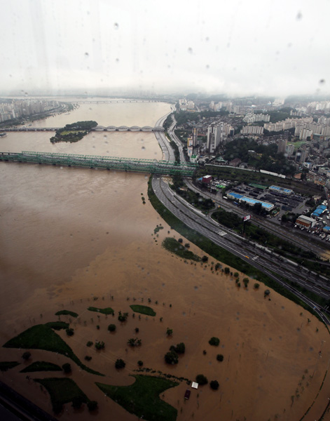 | ▲ 서울지역에 400mm가 넘는 폭우가 쏟아진 가운데 27일 서울 여의도 63빌딩에서 바라본 한강과 올림픽대로. 한강 둔치는 완전히 물에 잠겨 있고 올림픽대로 일부분이 범람해 교통이 통제되고 있다. (연합뉴스) | ||