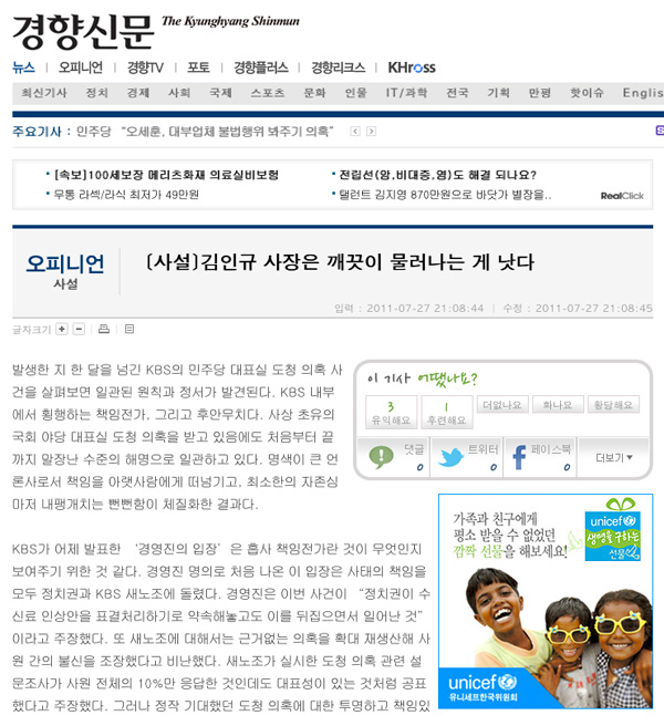 경향신문이 28일 사설에서 김인규 KBS 사장의 사퇴를 거론했다.
