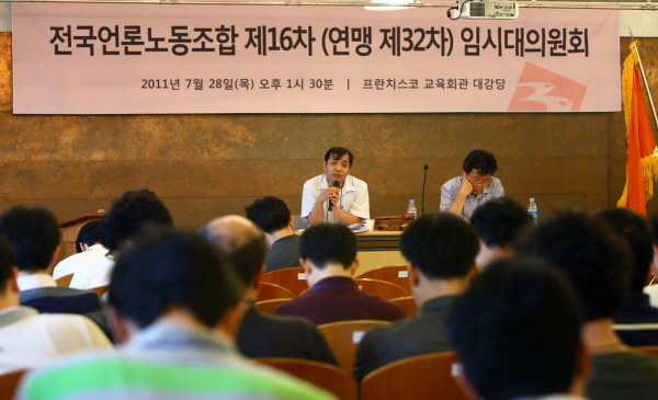전국언론노동조합(언론노조)는 28일 서울 중구 프란치스코 교육회관 4층 대강당에서 임시대의원 대회를 열고, 8월 ‘조중동 방송 광고 직거래 저지와 공공방송 복원을 위한 언론노조 총파업’ 찬반투표를 벌이기로 결의했다.