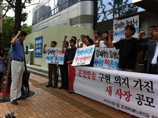 | ▲ 1일 방송문화진흥회 사무실이 있는 서울 여의도 율촌빌딩 앞에서 전국언론노조 MBC본부 소속 노조원들이 김재철 사장 사표 제출과 관련해 연 기자회견에서 구호를 외치고 있다. | ||