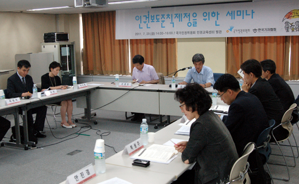 한국기자협회와 국가인권위원회가 지난달 29일 서울 중구 무교동 국가인권위 인권교육센터 별관에서 인권보도준칙 제정을 놓고 토론회를 가졌다. 두 단체는 인권보도준칙 전문, 총강, 그리고 민주주의와 인권 등 7개 분야별 요강을 잠정 확정한 상태다.