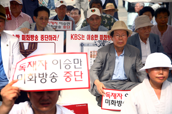 ▲ 2일 서울 여의도 KBS 본관 앞에서 열린 ‘이승만 미화방송 중단 및 KBS 김인규 사장 퇴진 촉구를 위한 무기한 1일 릴레이 단식 농성 돌입 선포식에 독립운동가 후손 등이 참석해 연설을 듣고 있다. (언론노조 제공) |