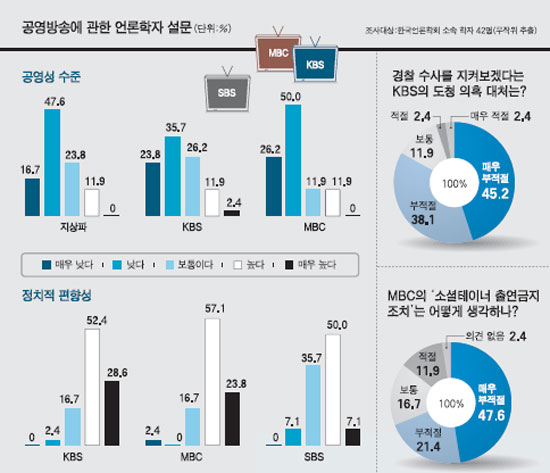 KBS·MBC·SBS의 정치적 편향성에 대해서도 비판적인 의견이 많은 것으로 나타났다. 설문에 참여한 학자 81%가 KBS의 정치적 편향성 정도가 높다(“높다” 52.4%, “매우 높다” 28.6%)고 대답했다. MBC에 대해서도 80.9%가 편향성이 높다(“높다” 57.1%, “매우 높다” 23.8%)고 대답했다.