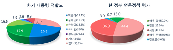 차기 대통령이 가장 먼저 펼쳐야 할 언론정책으로는 ‘낙하산·측근 언론사 및 언론기관장 임명 등 언론장악 불가 천명’(48.6%)이 꼽혔다. ‘신문 등 활자매체 및 지역언론 지원’(21.6%), ‘특정언론 특혜 금지’(20.4%), ‘미디어광고시장 확대’(8.2%) 등도 순위에 올랐다.