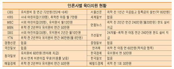 신문 중에선 조선일보가 가장 육아지원이 많았다. 이 신문은 과거 3~4세 자녀에 대해 연 1백80만원, 5~6세 자녀에 대해 연 1백20만원을 지급했다. 최근에는 만2세에서 취학 전까지 2백40만원을 실비로 지급하는 등 지원책이 강화됐다.