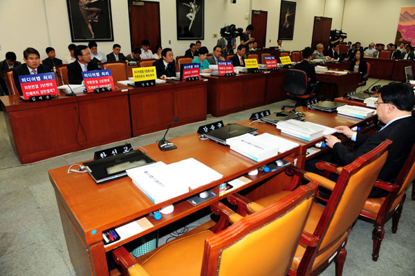 ▲ 22일 오전 국회에서 열린 문화체육관광방송통신위원회 전체회의에서 민주당 의원들의 자리에 8월 임시국회에서의 미디어렙 법안 처리를 촉구하는 손팻말이 붙어 있다. (뉴시스) |