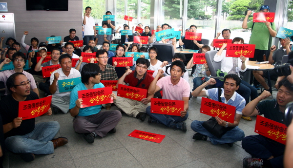 ▲ 전국언론노조 소속 노조원들이 25일 서울 여의도 국회 의원회관 면회실에서 미디어렙 입법을 촉구하는 연좌시위를 벌이고 있다.(사진=언론노조) |