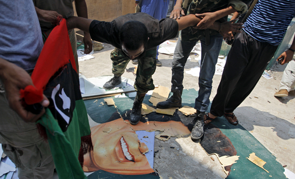 | ▲ 24일(현지시각) 리비아 반정부군이 수도 트리폴리의 카다피 국가원수 관저 밥 알-아지지야에서 구호를 외치며 카다피 초상화를 찢고 있다. 리비아 반정부군은 리비아의 95%가 반군 통제하에 있다고 밝혔다. (트리폴리(리비아)=AP/뉴시스) | ||