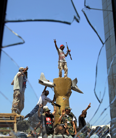 | ▲ 24일(현지시각) 리비아 반정부군이 수도 트리폴리의 카다피 국가원수 관저에서 부서진 동상 위에 올라가 포즈를 취하고 있다. (트리폴리(리비아)=AP/뉴시스) | ||