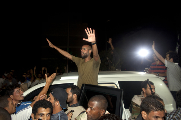| ▲ 리비아 반군에 생포된 것으로 알려졌던 카다피의 아들 사이프 알-이슬람이 23일 새벽(현지시각) 트리폴리의 릭소스 호텔에 모습을 나타내 카다피 지지세력에 손을 흔들고 있다. (트리폴리(리비아)=AP/뉴시스) | ||