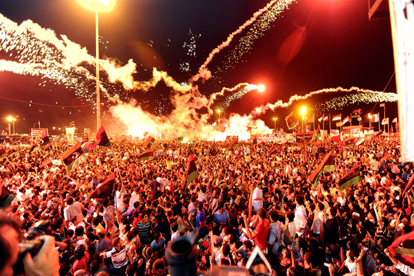 | ▲ 리비아 반군의 트리폴리 함락과 그에 따라 카다피의 사임이 임박했다는 소식이 전해지자 22일(현지시각) 벵가지의 타흐리르 광장에 모인 시민들이 환호하고 있다. (벵가지(리비아)=신화/뉴시스) | ||