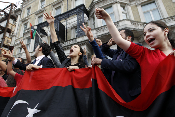 | ▲ 리비아 반군의 트리폴리 함락과 그에 따라 카다피의 사임이 임박했다는 소식이 전해지자 22일(현지시각) 영국 런던의 리비다 대사관 앞에 모인 리비아인들이 환호하고 있다. (런던(영국)=AP/뉴시스) | ||