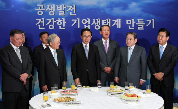 ▲ 이명박 대통령이 지난달 31일 오후 서울 중구 남대문로 대한상의에서 30대 대기업 총수들과 오찬 간담회에 앞서 환담하고 있다. 간담회에는 이건희, 정몽구 회장, 전경련 회장인 허창수 GS그룹 회장, 손경식 대한상의 회장, 정준양 포스코 회장 등 30대 그룹 총수들이 참석했다. (연합뉴스) |