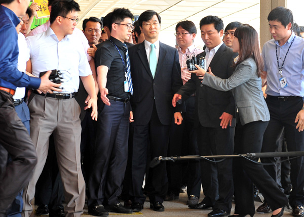 ▲ 6일 오후 서울시 교육감 선거후보 단일화 과정에서 뒷거래 의혹을 받고 있는 곽노현 서울시 교육감이 서울시 서초구 서울중앙지검으로 소환되고 있다. (뉴시스) |