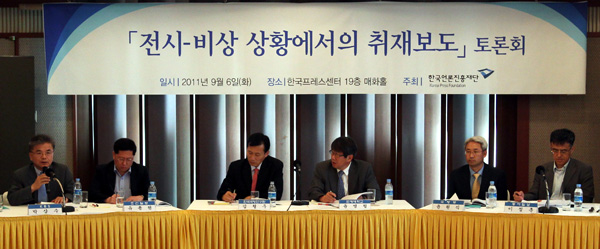 국가 비상사태에서 언론은 어디까지 보도할 수 있나. 지난해 천안함 사건을 계기로 확인된 이 해묵은 과제를 풀기 위한 ‘전시·비상상황에서 취재보도’ 토론회가 한국언론진흥재단 주최로 6일 서울 중구 한국프레스센터에서 열렸다.