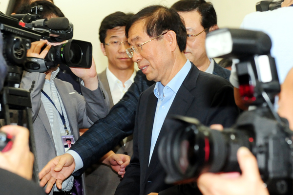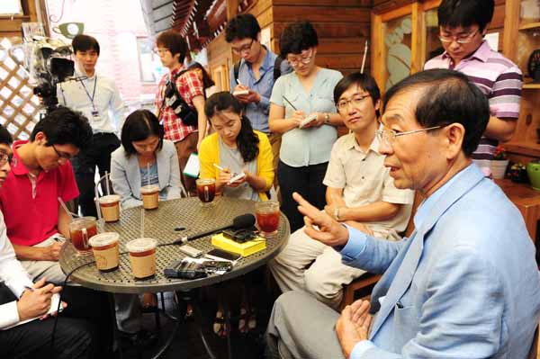 | ▲ 10ㆍ26 서울시장 보궐선거 출마하는 박원순 희망제작소 상임이사가 9일 서울 안국동 아름다운가게 1호점을 방문한 자리에서 기자들의 질문에 답하고 있다. 아름다운 가게는 박원순 변호사가 2001년 1% 나눔,기부운동과 더 나은 대안적 사회를 만들기위해 설립 했다.(뉴시스) | ||