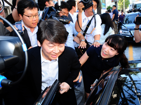 | ▲ 박원순 변호사로 서울시장 후보 단일화를 발표한 6일 오후 서울 세종문화회관 수피아홀에서 안철수 원장이 기자회견을 마치고 떠나면서 다른 사람의 차를 타고 있다.(뉴시스) | ||