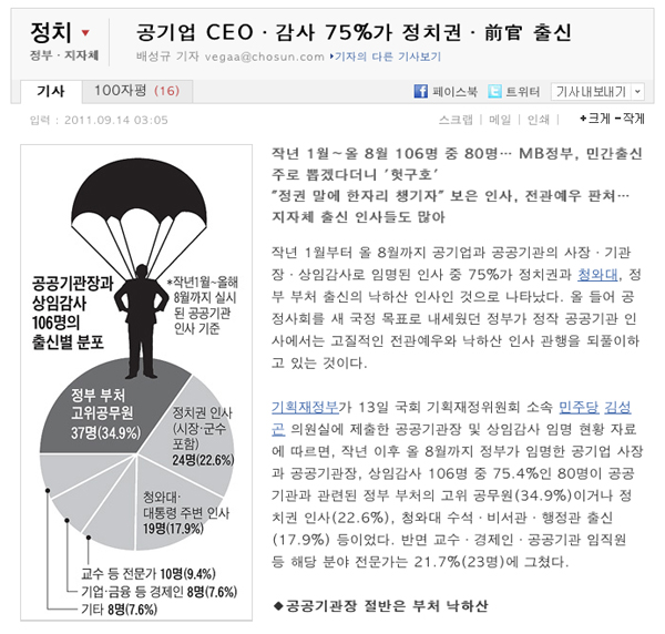| ▲ 공공기관 낙하산 인사 관련 조선일보 보도. | ||