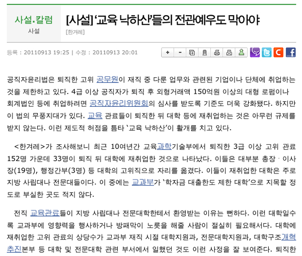 | ▲ 교육과학기술부 고위 공무원들의 대학 재취업과 관련한 한겨레 사설. | ||