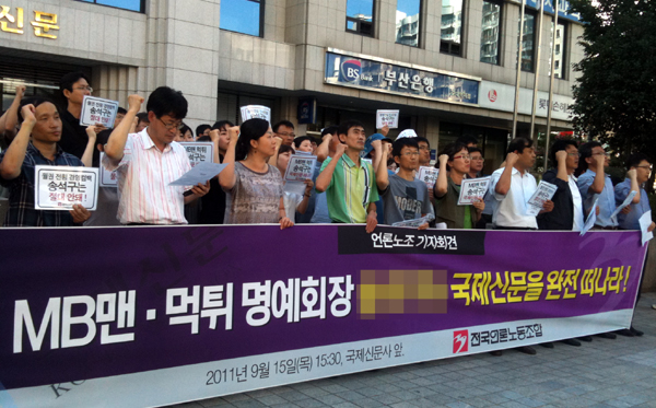 국제신문지부는 15일 오후 부산시 연제구 국제신문사 앞에서 전국언론노조 이강택 위원장과 지부장 등 1백50여 명의 조합원이 참여한 가운데 ‘MB맨 국제신문 명예회장 완전 퇴출 촉구 언론노조 기자회견’을 여는 등 퇴진투쟁을 이어갈 방침이다.