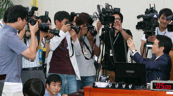 ▲ 개국을 앞둔 종편 보도국은 취재현장을 다니며 영상자료를 찍느라 분주하다. 사진은 지난달 31일 국회 외교통상위원회 전체회의 장면을 찍고 있는 카메라·사진기자들.(연합뉴스) |