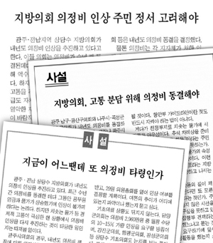 광주·무등·전남매일 등 사설 통해 반대 천명광주·전남지역 상당수 지방의회가 의정비 인상을 추진하고 있는 가운데 지역 신문들은 사설을 통해 의정비 인상이 바람직하지 않다고 주장했다.