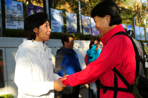 | ▲ 한나라당 나경원 서울시장 후보가 3일 오전 서울 관악산을 찾아 등산로 입구에서 등산객들과 인사를 나누고 있다. (뉴시스) | ||