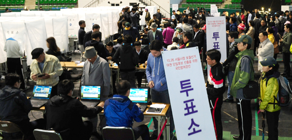 | ▲ ‘서울시장 야권단일후보 선출 국민참여경선'이 열린 3일 오전 서울 중구 장충체육관에서 시민들이 투표를 하고 있다.(뉴시스) | ||