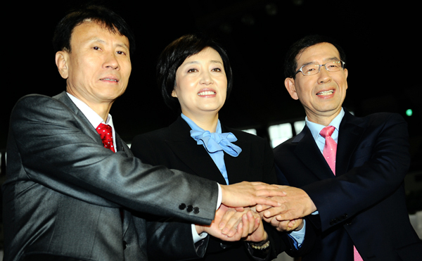 | ▲ 시민사회 대표 박원순 후보와 민주당 박영선 후보, 민주노동당 최규엽 후보가 3일 오전 서울 장충체육관에서 열린 10·26 서울시장 보궐선거 야권 후보 단일화를 위한 국민참여경선에서 투표전 손을 맞잡고 포즈를 취하고 있다.(뉴시스) | ||