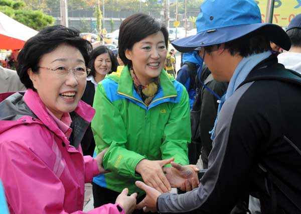| ▲ 2일 오전 서울 서초구 원지동 청계산 입구 원터골을 찾은 민주당 박영선 서울시장후보와 한명숙 전 총리가 청계산에 산행온 시민들과 악수를 나누고 있다. (뉴시스) | ||