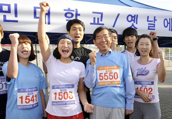 | ▲ 박원순 서울시장 후보가 2일 오전 서울 상암동 월드컵경기장 평화공원에서 열린 '2011 환경마라톤대회'에 참석해 시민들과 기념촬영을 하고 있다. (뉴시스) | ||