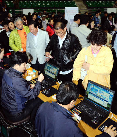 | ▲ 3일 오전 서울 장충체육관에서 열린 10.26 서울시장 보궐선거 야권 후보 단일화를 위한 국민참여경선에서 시민들이 투표를 위해 신분확인을 하고 있다.(뉴시스) | ||
