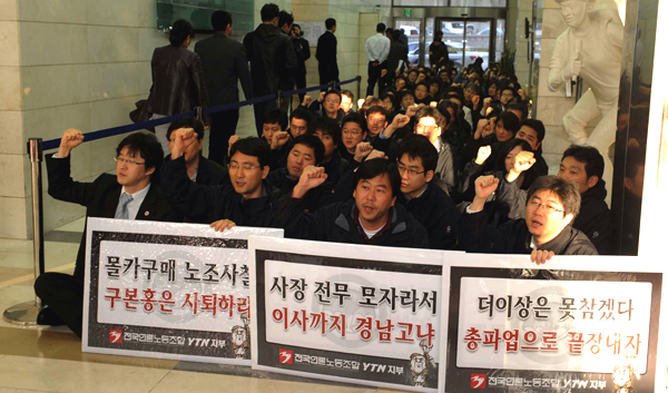 | ▲ YTN 해고 사태 이후 임금단체협상이 결렬됐던 2009년 3월 열린 YTN노조 시한부 총파업 출정식에서 조합원들이 구호를 외치고 있다. (뉴시스) | ||