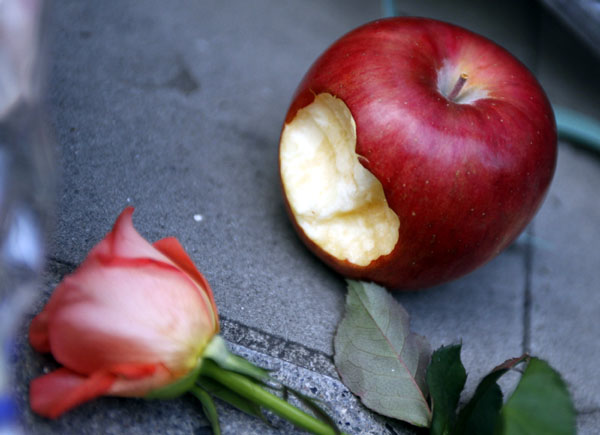 | ▲ 6일 일본 도쿄의 시부야 애플 매장 앞에 故 스티브 잡스를 추모하는 사과 한 알이 꽃과 함께 놓여 있다. (도쿄(일본)=로이터/뉴시스) | ||